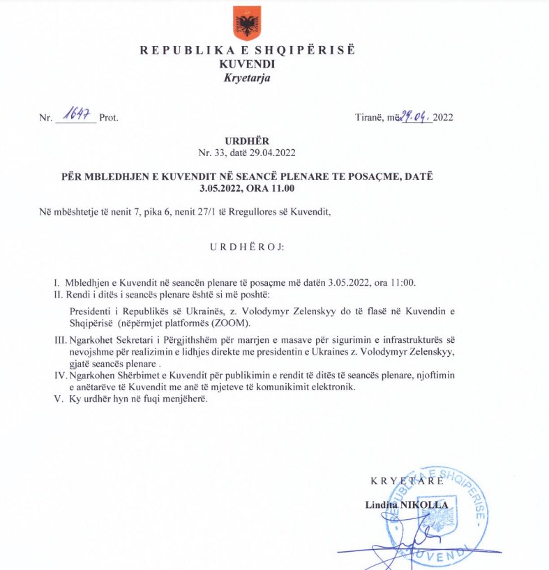 Kryetarja e Kuvendit Lindita Nikolla ka nxjerrë urdhrin për mbledhjen e seancës së posaçme të Kuvendit më datën 3 maj, ku Presidenti i Ukrainës, Volodomyr Zelensky do i drejtohet Kuvendit të Shqipërisë përmes një video lidhje.