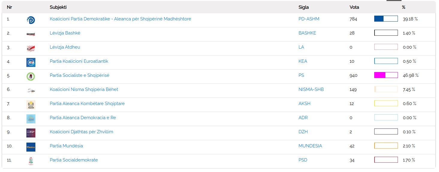 Nga rezultatet paraprake Partia Socialiste është në avantazh me 940 vota. Koaliacioni PD-Aleanca për Shqipërinë Madhështore me 784 vota.