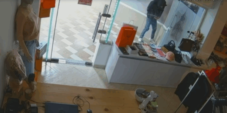 Sipas pamjeve të kamerave të sigurisë të bizneseve në këtë qendër tregtare, personi i cili mendohet të jetë rreth moshë 30 vjeç shihet teksa ofendon dhe shan, ndërkohë që vijon të dëmtojë pronën.
