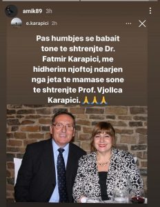 “Pas humbjes se babait tone te shtrenjte Dr. Fatmir Karapici para pak ditesh, e derrmuar njoftoj ndarjen nga jeta te mamase sone Prof. Vjollca Karapici”, shkruan vajza e tyre Amanda.
