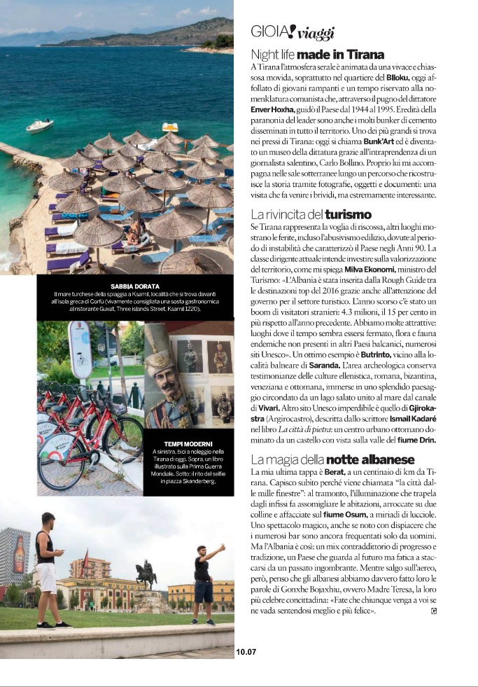 Në Tiranë, atmosfera e mbrëmjeve ndizet nga një gjallëri e zhurmshme, sidomos tek ish Blloku, i cili frekuentohet sot nga të rinj plot jetë dhe që njëherë e një kohë ishte i rezervuar për nomenklaturën komuniste, që nën thundrën e diktatorit Enver Hoxha udhëhoqi vendin nga 1944-1985. Një prej paranojave që u trashëguan nga diktatori janë edhe bunkerët e shumtë që gjenden në të gjithë territorin. Një prej më të mëdhenjve gjendet në afërsi të Tiranës; sot quhet Bunk’Art dhe është kthyer në një prej muzeve të diktaturës, falë angazhimit të gazetarit salentin Carlo Bollino. Është pikërisht ai që më shoqëron në sallat e nëndheshme, përgjatë një rrugëtimi që rindërton historinë përmes fotove, objekteve e dokumenteve; një vizitë që përçon të dridhura, por gjithsesi tejet interesante.