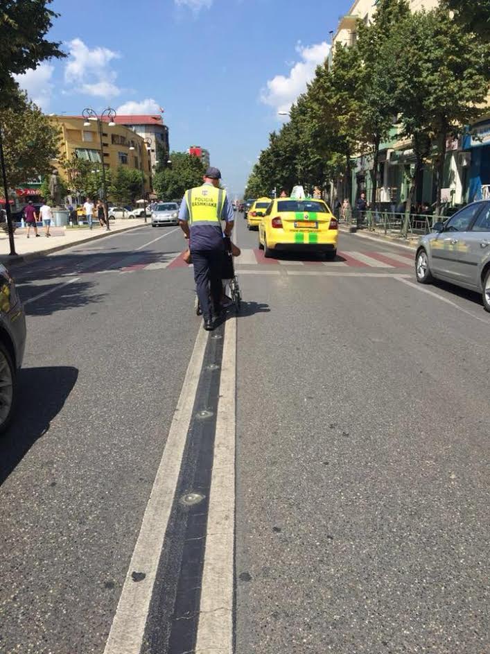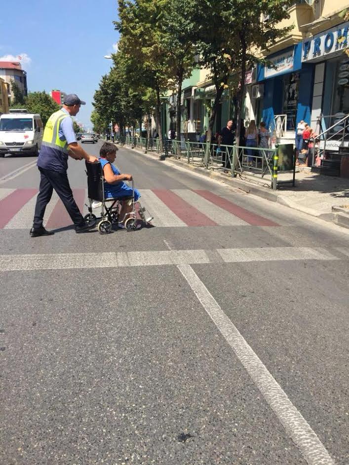 Në një foto të publikuar nga kryebashkiaku Erion Veliaj shihet një prej efektivëve të Policisë Bashkiake i cili ndihmon që të kalojë në anën tjetër të rrugës së Kavajës një person me aftësi të kufizuara.