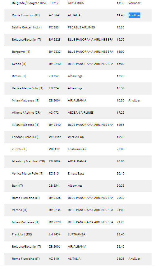 Sic mund ta shihni ne tabelen me poshte, marre nga faqja e internetit të Aeroportit të Rinasit, rezulton se për momentin janë anuluar të paktën tre fluturime drejt Italisë.