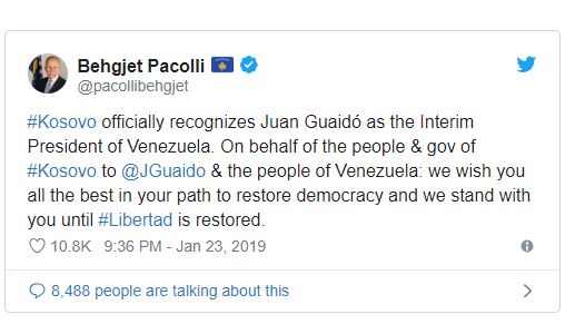 “Kosova zyrtarisht e pranon Juan Guaidon si president të përkohshëm të Venezuelës. Në emër të popullit dhe Qeverisë së Republikës së Kosovës i urojmë popullit të Venezuelës gjithë të mirat në rrugën e tyre drejt demokracisë. Do të qëndrojmë përkrah jush derisa të kthehet liria”, kishte shkruar ministri i Punëve të Jashtme të Republikës së Kosovës, Behgjet Pacolli.