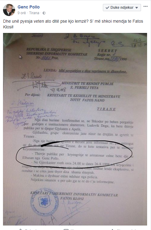 Ish-ministri i Arsimit, Genc Pollo është kthyer pas në kohë, pikërisht në ngjarjet e vitit 1998, duke e zbardhur kete dokument dhe duke treguar ndoshta jo pa nostalgji se ishte ne syte e SHISH ne ate kohe, por në asnjë moment nuk e kundërshton informacionin.