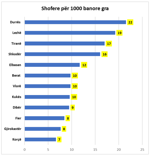 Kështu në vend të dytë renditet qarku i Lezhës, ku sipas përllogaritjeve për çdo 1000 gra u pajisën me leje drejtimi 19, i ndjekur nga Tirana dhe Shkodra me përkatësisht 17 dhe 16 gra të pajisur për 1000 banore gra. Në Elbasan në 2018-n u lëshuan 12 leje drejtimi për 1000 gra.