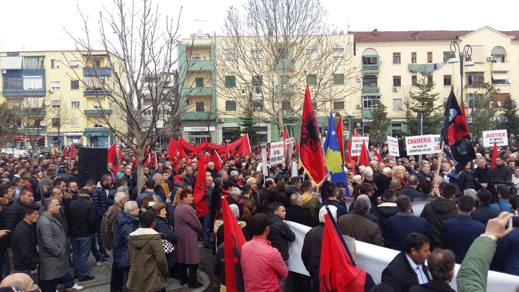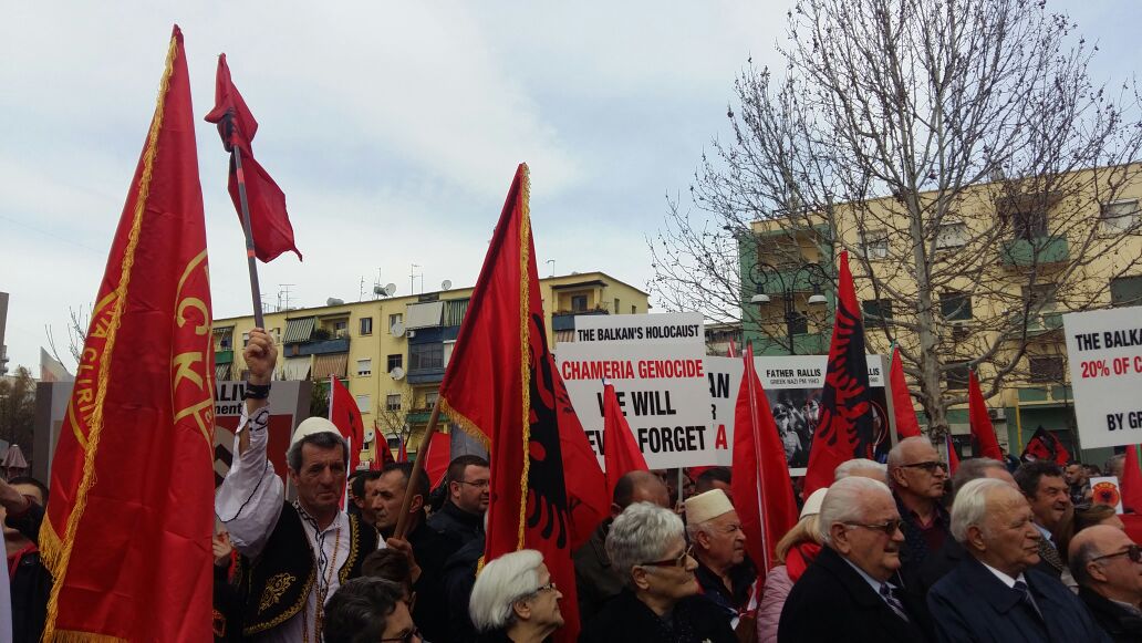 Dhjetëra qytetarë çamë me flamuj kuqezi por edhe me plisa të bardhë kanë marrë pjesë në protestë duke kërkuar transparencë për marrëveshjen Shqipëri-Greqi.