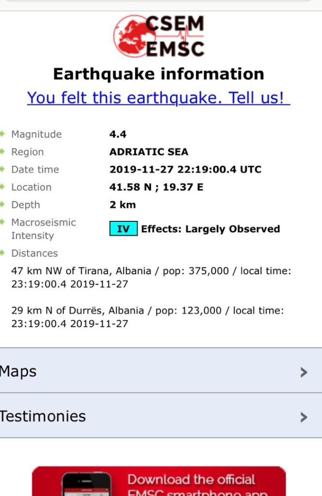 Sipas EMSC-së, lëkundja ka qenë me magnitudë 4.4 i Shkallës Rihter. Epiqendra është regjistruar në Detin Adriatik 29 km në veri të Durrësit, si dhe 47 km nga Tirana.