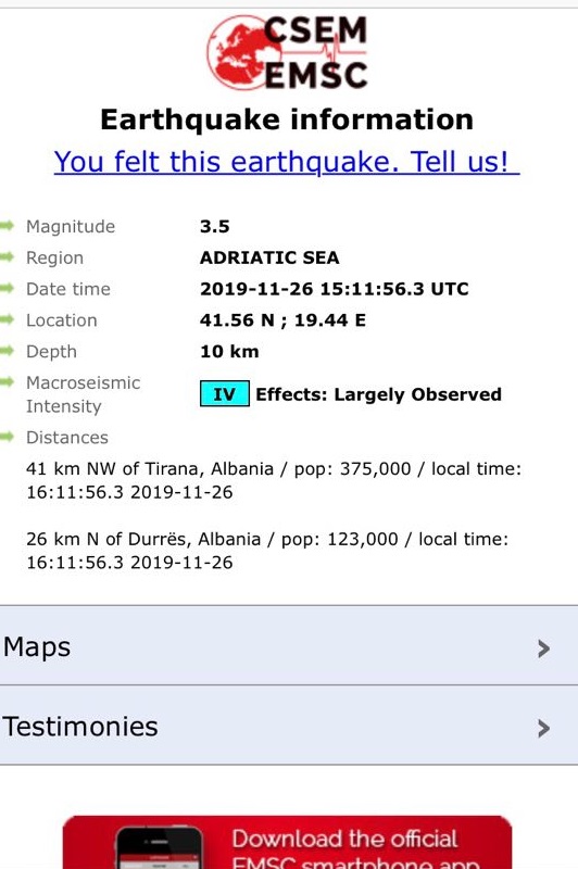 Sipas EMSC-së, lëkundja ka qenë me magnitudë 3.5 i Shkallës Rihter. Epiqendra është regjistruar në Detin Adriatik 26 km në veri të Durrësit si dhe 46 km nga Tirana.