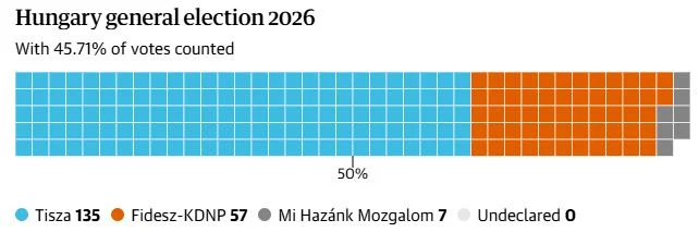 Sipas parashikimeve aktuale, Tisza e Magyar pritet të sigurojë 135 vende në parlament, 2 më shumë shumica prej 2/3 ose 133 vende që kërkon. Partia Fidesz e Orban mbetet me 57 vende, ndërsa Mi Hazank ka arritur 7 vende.
