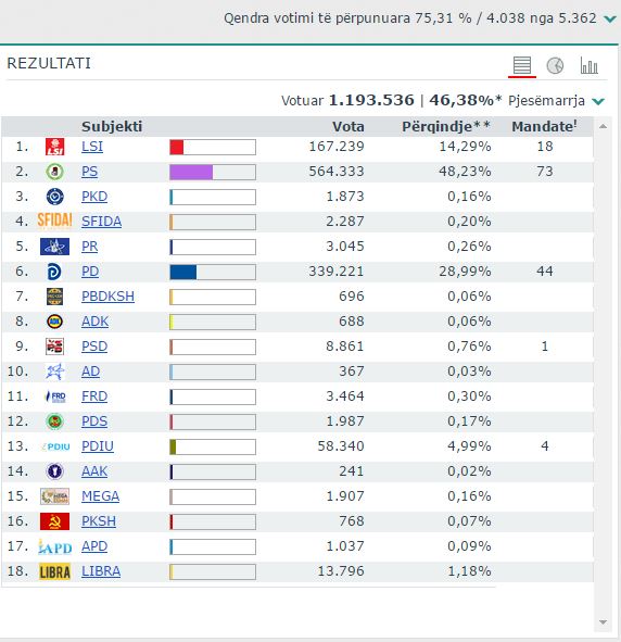 E PËRDITËSUAR/ Numërohen 4515 nga 5362 kuti në rang kombëtar. Nga numërimi i deritanishëm rezulton se Partia Socialiste kryeson me shumicë votash duke siguruar 73 mandate me përditësimin e të dhënave. Duket se Partia Socialiste është pranë një fitoreje historike, që i mundëson formimin e qeverisë e vetme. Bazuar tek numërimi deri tanishëm, rezulton se projeksioni për ndarjen e mandateve është si më poshtë: