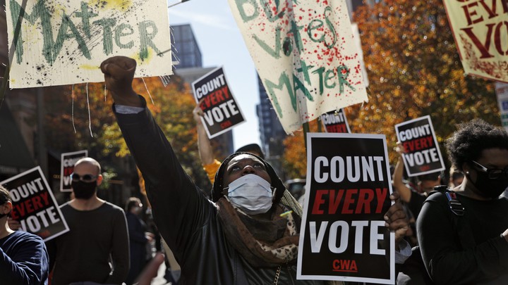 Qindra demokratë u mblodhën të premten pranë ndërtesës së numërimit të votave në Filadelfia, të veshur me bluza të verdha ku shkruhej “Numëro çdo votë” dhe duke kërcyer në rrugë.
