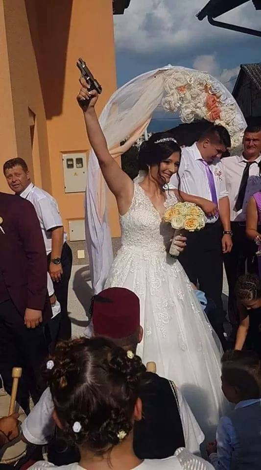 E veshur me fustanin e nusërisë, në njërën dorë mban lulet, e në tjetrën një revole.