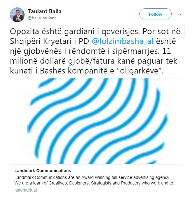“Opozita është gardiani i qeverisjes. Por sot në Shqipëri Kryetari i PD Lulzim Basha është një gjobvënës i rëndomtë i sipërmarrjes. 11 milionë dollarë gjobë/fatura kanë paguar tek kunati i Bashës kompanitë e “oligarkëve. Postim i Taulant Ballës në Twitter