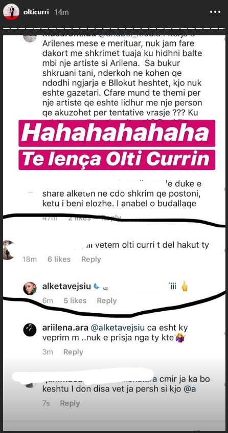 Në një postim, një fans i saj i ka shkruar Alketës se “vetëm Olti Curri të del hakut ty”. Ky koment mesa duket e ka acaruar shumë moderatoren dhe ajo i ka drejtuar gishtin e mesit me një emoji.