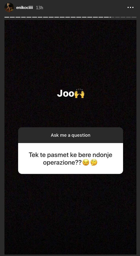 Në rubrikën “Ask me” në Instastory Eni ka vendosur të flasë për herë të parë për operacionet plastike që ka kryer. E pyetur nga ndjekësit se nëse ka kryer operacione plastike, Eni ka sqaruar se për shkak të problemeve shëndetësore e ka bërë hundën operacion. Ndërkohë që ka sqaruar të gjithë se nuk ka kryer asnjë operacion plastik në të pasmet e saj.