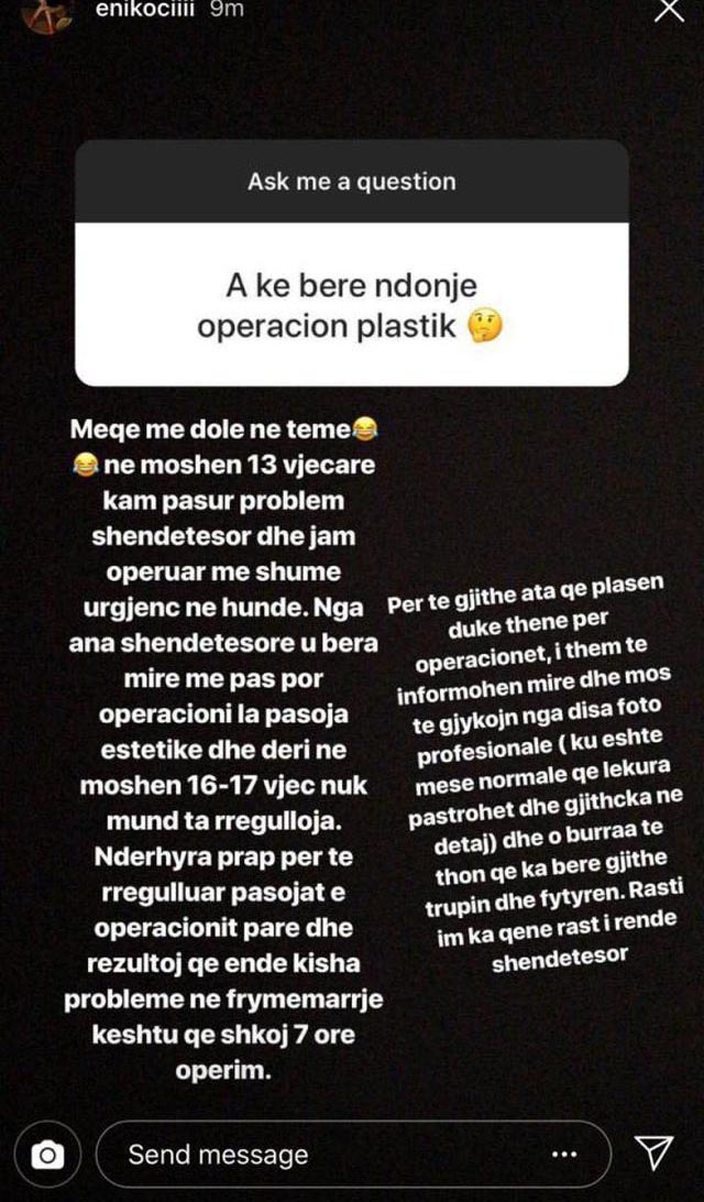 Për të gjithë ata që plasën duke thënë për operacionet, i them të informohen mirë dhe të mos gjykojnë nga disa foto profesionale (ku është mëse normale që lëkura pastrohet dhe gjithçka në detaj) dhe o burra të thonë që ka bërë gjithë trupin dhe fytyrën. Rasti im ka qenë rast i rëndë shëndetësor”,- ka shkruar Eni në Instagram./a.ç