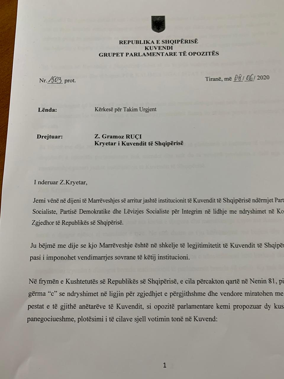 “Sot ne emer te tre grupeve parlamentare te opozites i kemi derguar kerkese zyrtare kryetarit te PS Z Rama dhe kryetarit te Kuvendit Z Ruçi per te diskutuar rreth REFORMES ZGDJEDHORE”, thuhet në letër.