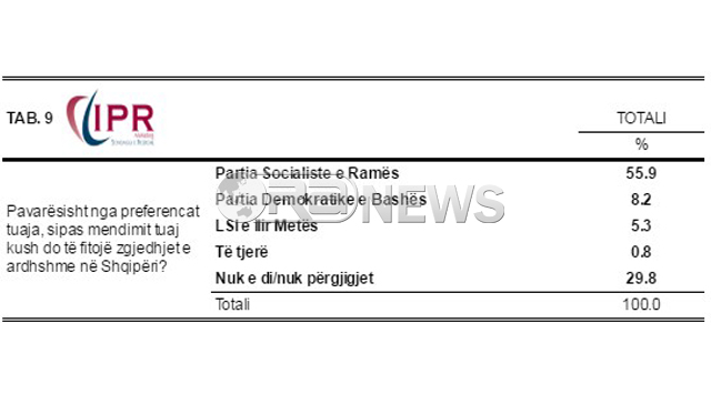 Nese zgjedhjet ne rang kombetar do te zhvilloheshin diten e sotme ato do te fitoheshin nga PS me nje diference prej 7% me ndjekesen me te afert qe eshte PD. Ky eshte edhe rezultati i dale nga sondazhi i IPR Marketing. Sipas ketij sondazhi PS do te merrte 43%, PD36%, LSI 12%, LIBRA 2.3%.
