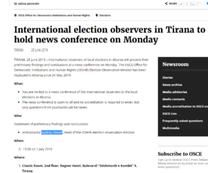 “Gjetjet paraprake dhe konkluzionet e paraqitura në konferencën për shtyp do të japin një vlerësim zyrtar të procesit zgjedhor për pajtueshmërinë e tij me angazhimet e OSBE-së dhe obligimet e tjera ndërkombëtare dhe standardet për zgjedhjet demokratike, si dhe me legjislacionin kombëtar. Misioni vëzhgues i Zyrës së OSBE-së për Institucionet Demokratike dhe të Drejtat e Njeriut (ODIHR) numëron 174 vëzhgues nga 33 vende dhe është i vetmi grup ndërkombëtar vëzhgimi në terren në Shqipëri për zgjedhjet lokale të 30 qershorit”, njofton OSBE.