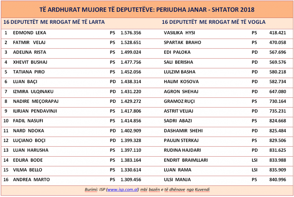 Në tabelën e mëposhtme ne kemi listuar vetëm 16 deputetët më shumë të paguar dhe 16 deputetët më pak të paguar në parlament gjatë sesionit të deritanishëm, për periudhën janar – shtator 2018. Sic shihet në tabelë, por siç rezulton edhe nga të dhënat për të gjithë deputetët, drejtuesit e parlamentit dhe të partive kryesore politike kanë përfitime financiare shumë më të pakta sesa 50% e deputetëve të Kuvendit.