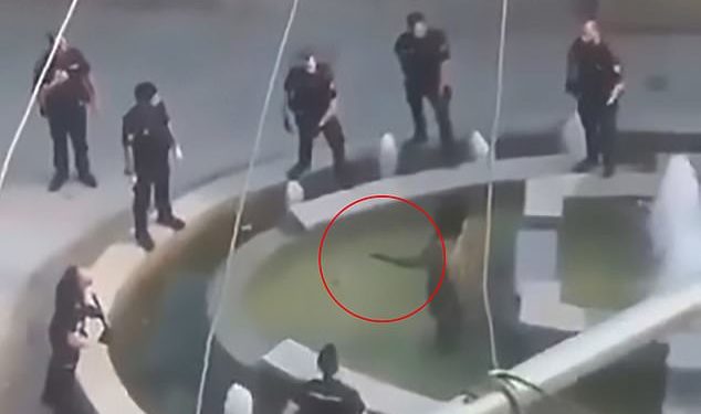 Në pamjet filmike do të shikoni disa oficerë policie që rrethojnë një burrë i cili qëndron në mes të një shatërvani me një hanxhar në dorën e djathtë.