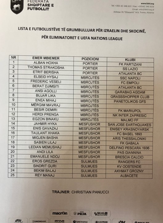 Trajneri i Kombëtares shqiptare Chrsitian Panucci në një konference për mediat ka publikuar listën e futbollistëve që do të luajnë në përballjen me Izraelin dhe Skocinë.