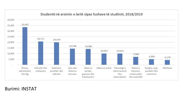 Të dhënat e INSTAT tregojnë se tregu i punës po mbushet me juristë e ekonomistë, që janë dhe dy degët më të preferuara nga studentet. Nga 139 mijë studentë që janë të regjistruar në vitin akademik 2018/2019, rreth 24% e tyre janë në fushën e studimit “Biznes, administrim dhe ligj”, 15% në “Shëndet dhe mirëqenie”, dhe e treta është “Inxhinieri, prodhim dhe ndërtim”, me 14% të totalit të studentëve të regjistruar.(Monitor)