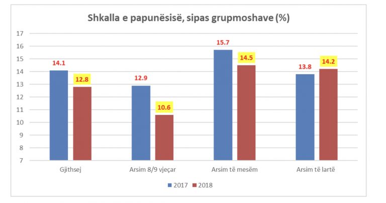 Tendenca e rritjes së papunësisë tek të arsimuarit e lartë ka ecuri në drejtim të kundërt me totalin e papunësisë në vend, që ra nga 14.1% në 2017-n, në 12.8% në 2018-n.