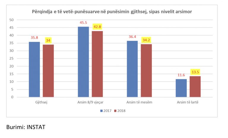 Të dhëna të tjera të INSTAT, tregojnë se 43% e të punësuarve me arsim 8/9-vjeçar janë të vetëpunësuar. Kjo peshë, që është shumë më e lartë në krahasim me ata që janë me arsim të lartë, teksa vetëm 13.5% e tyre kanë zgjedhur të hapin një aktivitet të tyrin privat, ku mbizotërojnë meshkujt (21.4), ndërsa femrat e kanë këtë tregues vetëm 7%. Gjithsesi, duket se pamundësia për të gjetur një punë i ka shtyrë dhe ata me universitet që t’i kthejnë sytë nga vetëpunësimi, që është rritur me gati 2 pikë përqindje në 2018-n. Kjo tendencë ka qenë e dukshme si te meshkujt (nga 17.7 në 21.4%) ashtu dhe tek femrat (nga 6.1 në 7%).