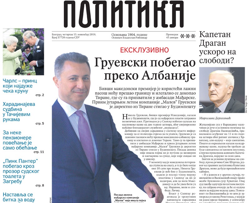 “Politika” shkruan se ish-kryeministri maqedonas me një pasaportë false ka ikur drejt Hungarise duke u strehuar nje nate ne Ambasaden hungareze ne Tirane, duke u nisur me pas ne mengjes heret me avion drejt Hungarise permes linjes ajrore te kompanise se ketij vendi.