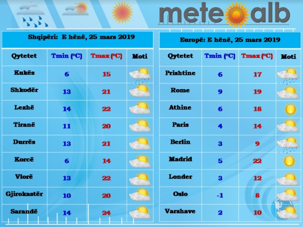 Sipas MeteoAlb, temperaturat e ajrit mbeten konstante në mëngjes por rënie sjellë mesdita duke luhatur vlerat ekstremale ditore nga 5°C deri në 24°C .