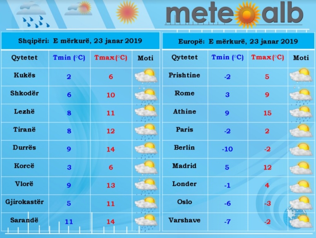 Sipas MeteoAlb, temperaturat e ajrit do të rriten lehtë në mëngjes dhe ulen në mesditë duke luhatur vlerat ditore nga -1°C në zonat malore deri në 14°C bregdeti.