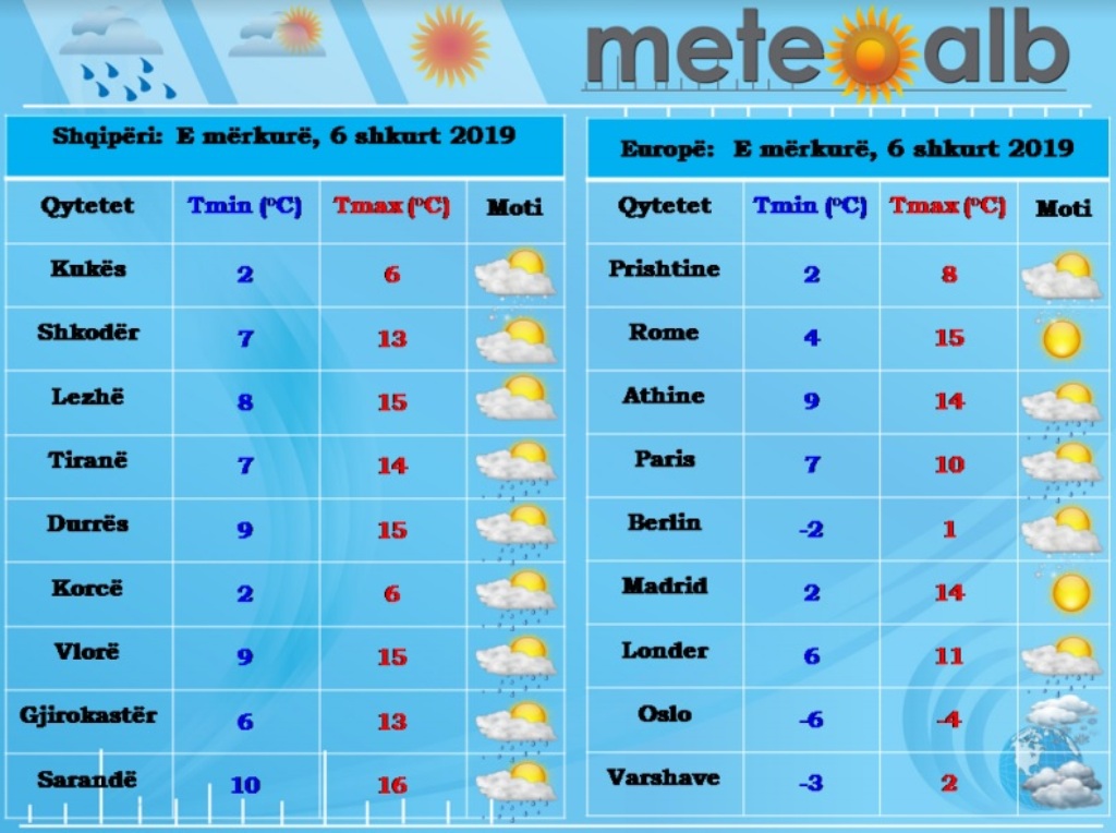 Sipas MeteoAlb, temperaturat e ajrit do të bien lehtë në mëngjes dhe mesditë duke u luhatur nga 0°C mëngjesi në zonat verilindore deri në 16°C mesdita në bregdet.