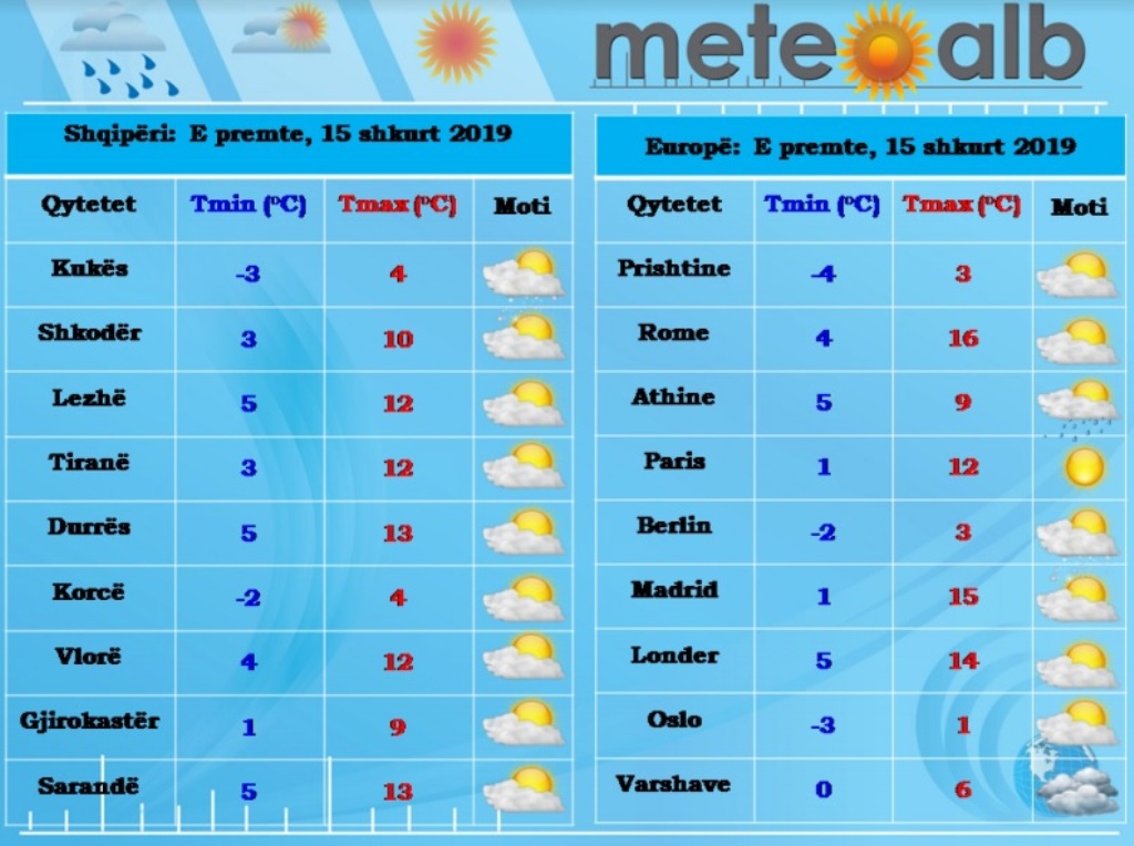 Sipas MeteoAlb, temperaturat e ajrit do të rriten lehtë në vlerat e mëngjesit por pritet rënie në orët e mesditës duke bërë që vlerat ditore të luhaten nga -4°C deri në 13°C.