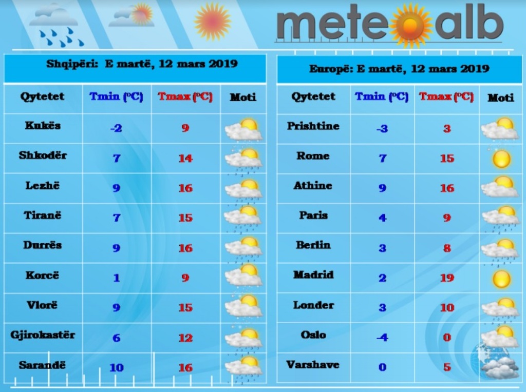 Sipas MeteoAlb, temperaturat e ajrit ulen ndjeshëm në mëngjes dhe mesditë duke luhatur vlerat ekstremale ditore nga -3°C deri në 16°C.