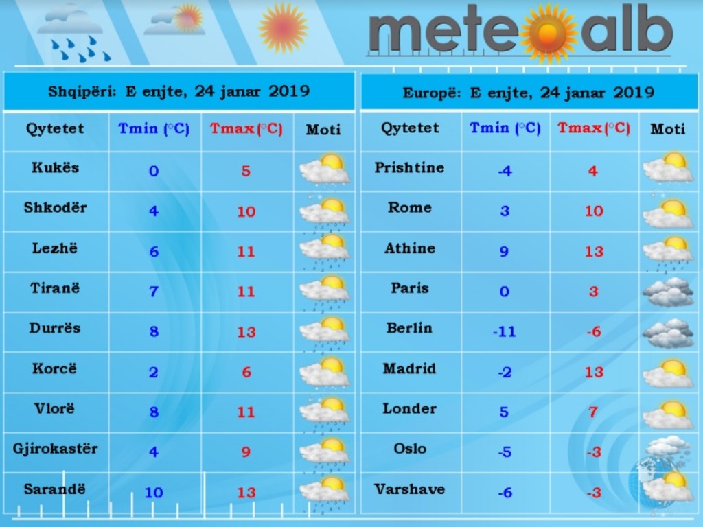 Sipas MeteoAlb, temperaturat e ajrit do të ulen lehtë në mëngjes dhe mesditë duke luhatur vlerat ditore nga -2 deri 13°C.