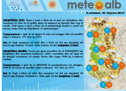 Era do fryjë mesatare në tokë dhe e fortë në det me shpejtësi 60 km/h nga drejtimi Veriore duke krijuar në det dallgëzim 5 ballë.