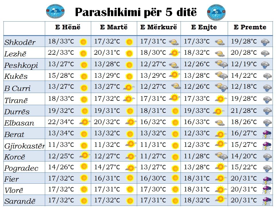 Në orët e mesditës do të ketë prezencë të vranësirave kalimtare më të theksuara në relievet malore dhe zonën e veriut. Këto vranësira do të shoqërohen me reshje shiu të dobta dhe lokale në relievet e larta malore.