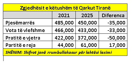 Por rezultatet e votave të këtushme të qarkut Tiranë më 11 maj (pa përfshirë diasporën) tregojnë se pjesëmarrja në zgjedhje jo vetëm që nuk u rrit, por u zvogëlua. Konkretisht, më 11 maj votuan vetëm 450 mijë zgjedhës të këtushëm, nga 485 mijë që votuan më 2021 – një tkurrje prej 35 mijë pjesëmarrësish.