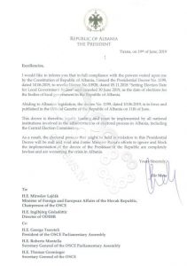 Në letrën që mban datën 19 qershor 2019 dërguar zyrtareve te OSBE/ ODHIR presidenti Meta i njofton zyrtarët se nëse zgjedhjet do të mbahen në kundërshtim me dekretin do të jenë nul dhe të pavlefshme.