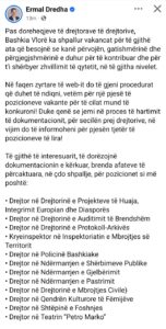 Pas dorëheqjeve të drejtorëve, Bashkia e Vlorës shpall vakancat për pozicionet respektive. Kreu i Bashkisë së Vlorës, Ermal Dredha, përmes një postimi në rrjetet sociale fton të interesuatit të dorëzojnë dokumentacionin brenda afateve të përcaktuara në çdo shpallje.