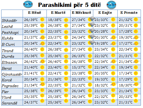 Moti do të jetë kryesisht i kthjellët por do të ketë edhe prezencë të vranësirave kalimtare shoqëruar me reshje shiu në formë shtrëngatash (dita e Mërkurë) në zonën e veriut. Dita e Enjte do të ketë vranësira kalimtare të cilat do të shoqërohen me reshje shiu të izoluara, njofton Shërbimi Meteorologjik Ushtarak.