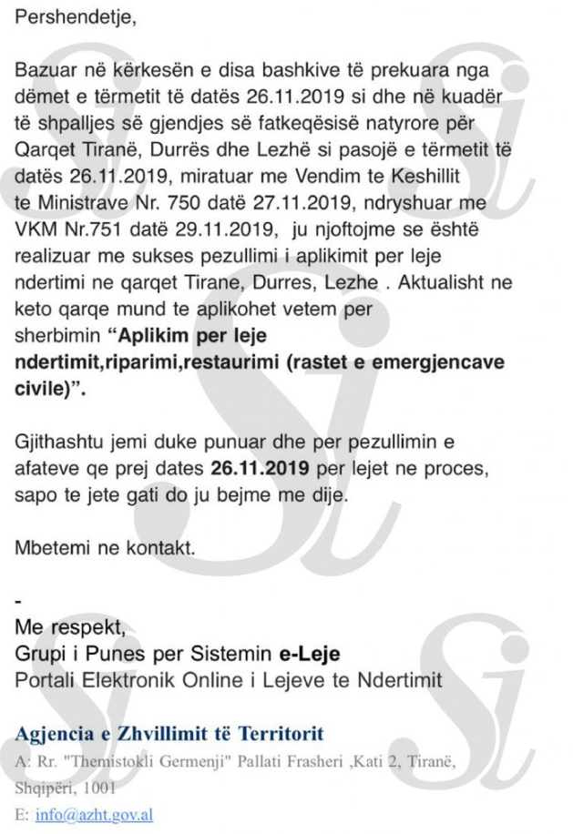 “Bazuar në kërkesën e disa bashkive të prekura nga dëmet e tërmetit të datës 26.11., si dhe në kuadër të shpalljes së gjendjes së fatkeqësisë natyrore për qarqet Tiranë, Durrës dhe Lezhë si pasojë e tërmetit të datës 26.11.2019, miratuar me vendim të Këshillit të Ministrave nr.750, datë 27.11.2019, ndryshuar me VKM Nr.751 datë 29.11.2019, ju njoftojmë se është realizuar me sukses pezullimi i aplikimi për leje ndërtimi në qarqet Tiranë, Durrës, Lezhë”, thuhet në njoftimin e shpërndarë nga Agjencia e Zhvillimit të Territorit.