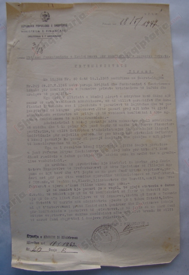 Me ligjën Nr. 40 datë 14.1.1945 modifikue me Dekret-Ligjën Nr. 249 dt. 27.V.1946 asht parapa krijimi dhe funksionimi i Komisioneve lokale për konfiskimin e Pasunive private kriminelëve të luftës dhe armiqve të popullit.
