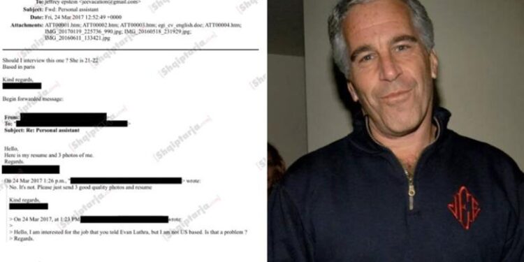 Në 3 milionë faqet e reja të publikuara lidhur me dosjen e Jeffrey Epstein shfaqet edhe emri i një vajze shqiptare, e cila rezulton që të ketë aplikuar për një vend pune si asistente personale. Sipas materialeve, rezulton që e reja me iniciale E.T., të ketë aplikuar në mars 2017.