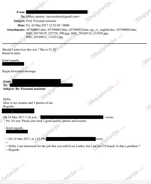 Pas marrjes së materialeve, i njëjti person ia përcjell email-in Jeffrey Epstein, duke e informuar se bëhet fjalë për një vajzë 21–22 vjeçe. Edhe pse në CV thuhet se vajza jeton në Tiranë, personi që i dërgon emailin Epstein i thotë se ajo jeton në Paris, dhe e pyetur: “A duhet ta intervistoj këtë?”