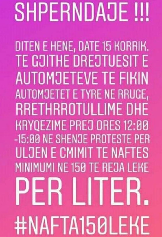 Aferat korruptive të kësaj qeverie ndalohen vetëm me protesta, si në rastin e Teatrit dhe të Unazës së Madhe. Prandaj i ftoj të gjithë t’i bashkohen thirrjes për protestë kundër taksave mbi naftën.