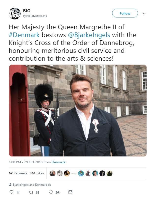 Mbretëresha e Danimarkës nderoi dje arkitektin e Teatrit të Ri me titullin Kalorës i Kryqit për merita në shërbim civil e kontribute në art dhe shkencë. Përkundër sulmeve të opozitës këtu në Shqipërisë e cila e shpalli edhe non-grata, arkitekti danez, Bjarke Ingels, që ka projektuar disa prej ndërtesave më të bukura në botë, është një nga më të vlerësuarit. “Për të kuptuar sa pa sens është “haxhi-qamilizmi” i disave me “persona non-grata” e histeri pa mend, Mbretëresha e Danimarkës sapo nderoi arkitektin e @TeatriRi me titullin Kalorës i Kryqit për merita në shërbim civil e kontribute në art & shkencë”, shkruan Veliaj.