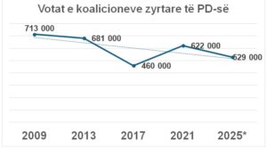Kështu, më 2009, koalicioni zyrtar i PD-së siguroi plot 713 mijë vota të vlefshme (shihni grafikun e mëposhtëm). Nga zgjedhja në zgjedhje, votat e koalicioneve të PD-së u tkurrën, dhe më 11 maj 2025 zbritën në 529 mijë.
